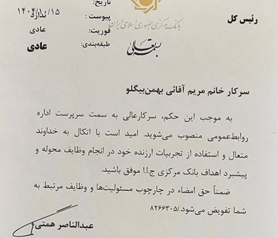 به گزارش ایران اکونا به نقل از خبرنگار اقتصادی خبرگزاری تسنیم، عبدالناصر همتی رئیس کل بانک مرکزی با صدور حکمی مریم آقائی را بعنوان سرپرست روابط عمومی این بانک منصوب کرد.
